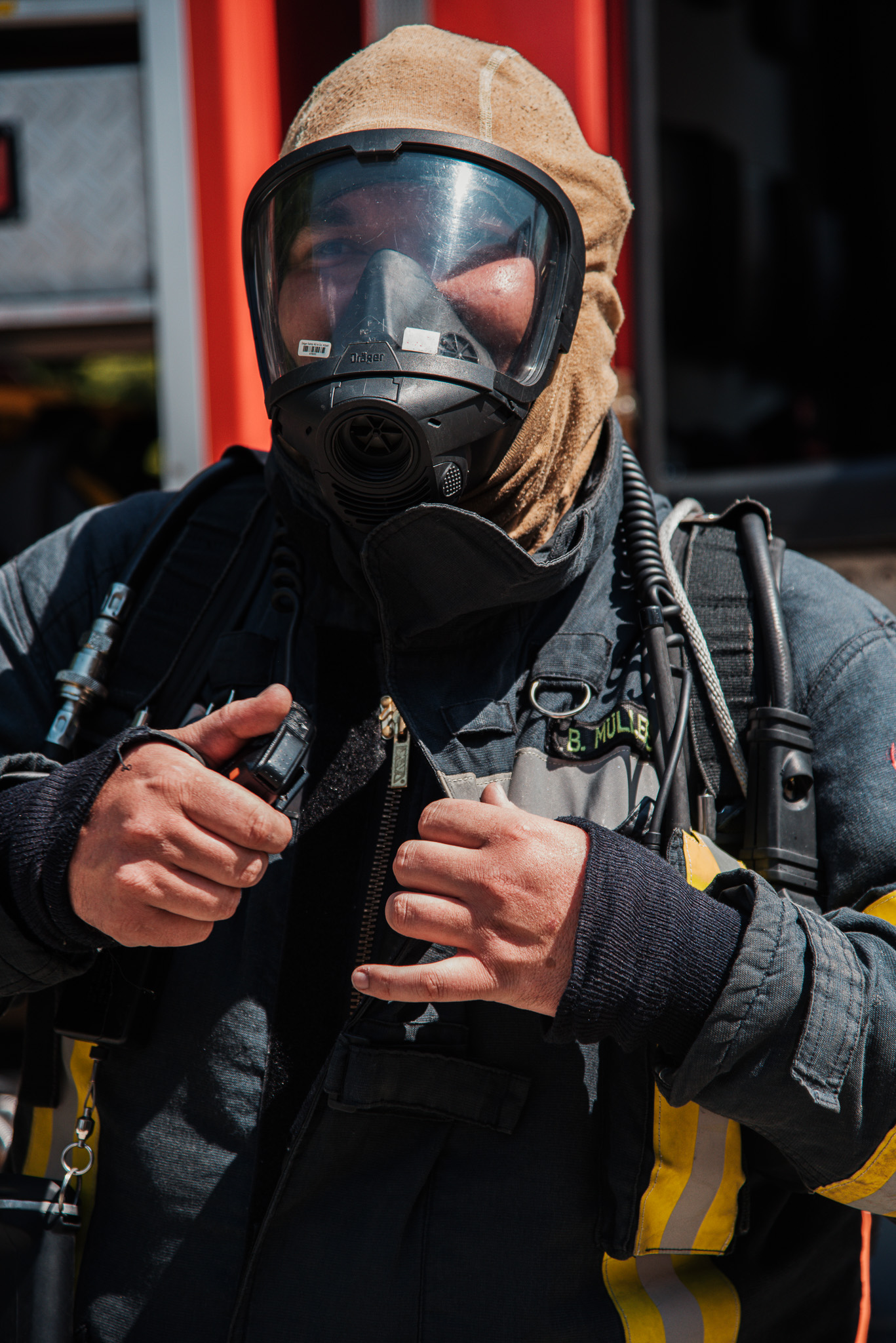 Unter dem Helm trägt die Einsatzkraft eine Feuerschutzhaube um sich das Gesicht und den Nacken vor Verbrennungen und heißen Gegenstände zu schützen.