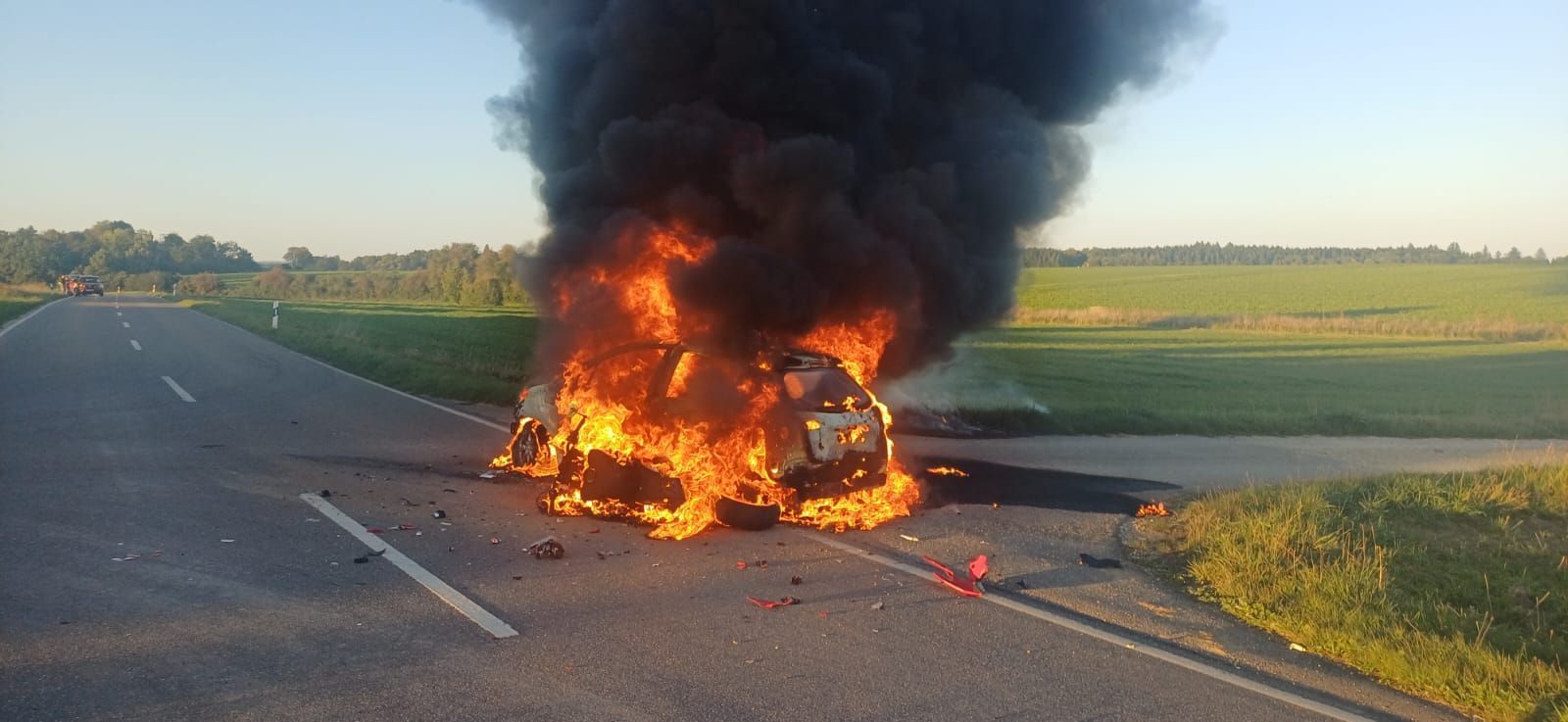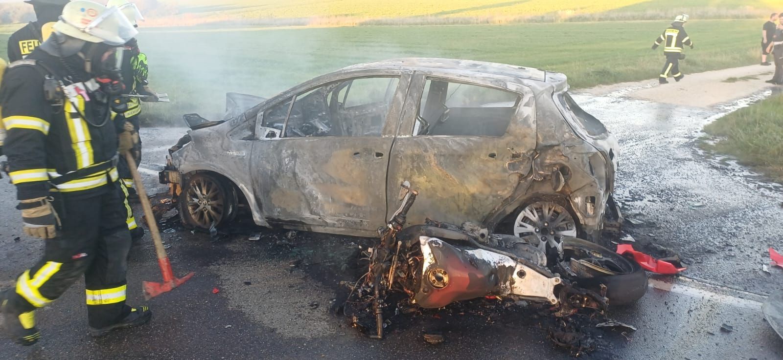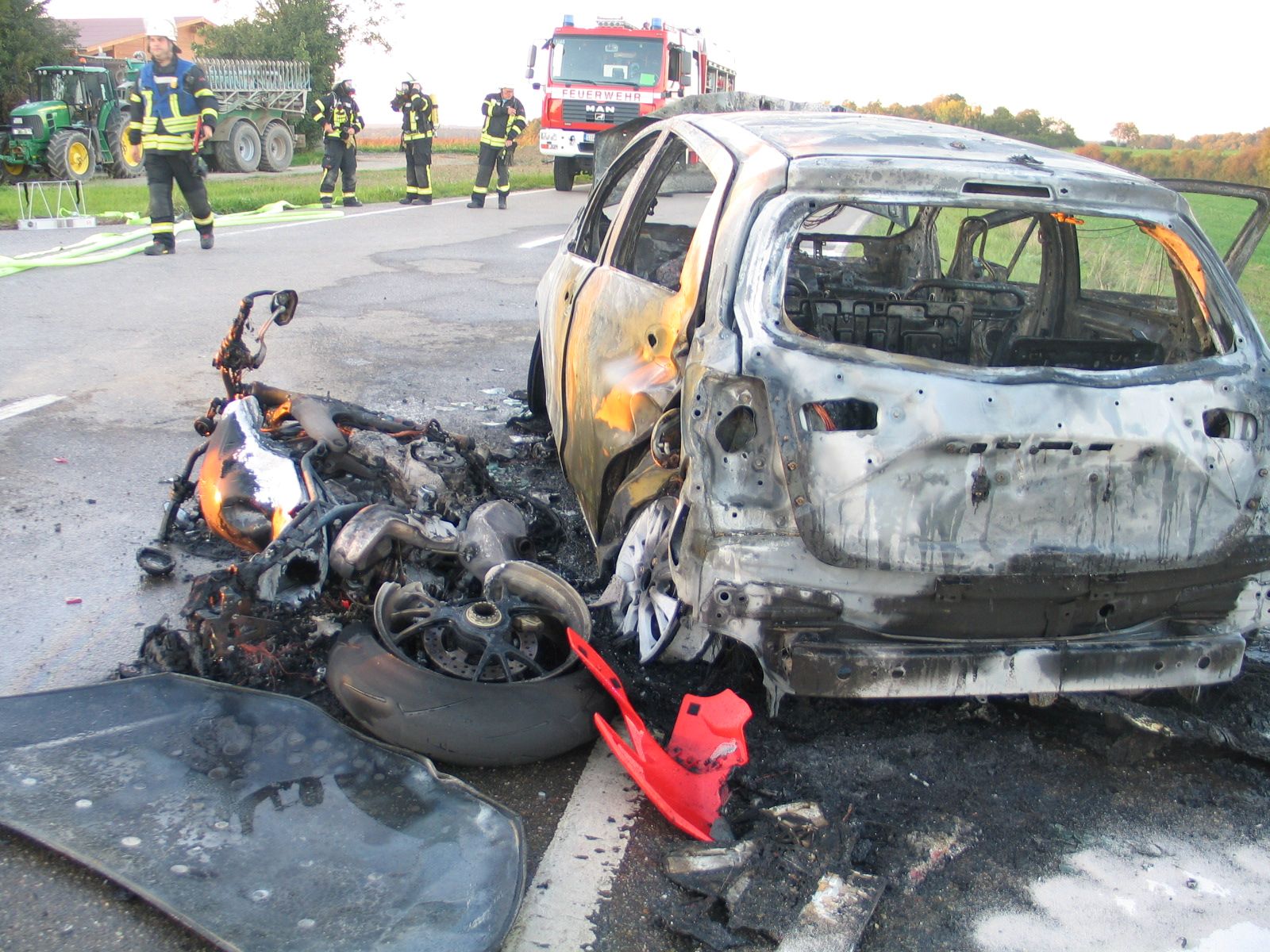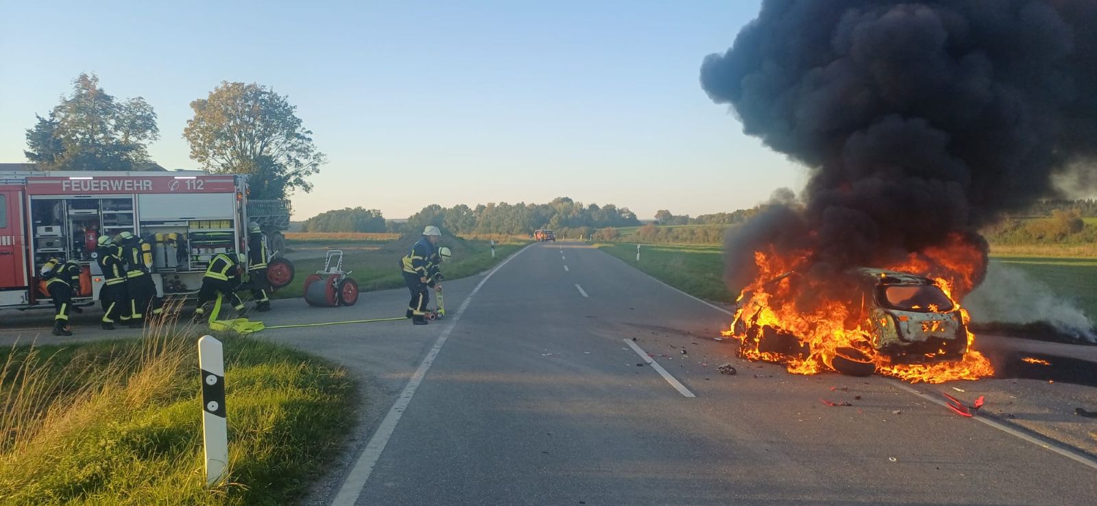 Auf der Kreisstraße 8241 zwischen Krauchenwies und Hausen a. A. kam es am Mittwochabend zu einer heftigen Kollision zwischen einem Pkw und einem Motorrad. Dabei gerieten beide Fahrzeuge in Brand und brannten vollständig aus. Der Motorradfahrer wurde schwer verletzt und kam mit dem Rettungshubschrauber ins Krankenhaus. Auch der Pkw Fahrer kam mit Verletzungen ins Krankenhaus. Der genaue Unfallhergang wird noch ermittelt. Die Feuerwehr Krauchenwies löschte die Fahrzeuge und fing die Betriebsstoffe auf. Außerdem waren der Rettungsdienst, die Polizei und die Helfer vor Ort Gruppe Krauchenwies im Einsatz. Der Sachschaden stand noch nicht fest. Die Straße war mehrere Stunden gesperrt.