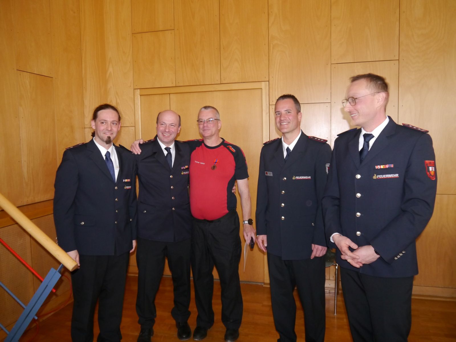 Bei der anschließenden Hauptversammlung gab es eine Beförderung und zahlreiche Ehrungen. Oliver L’Gaal wurde von Bürgermeister Manuel Kern zum Oberbrandmeister befördert.