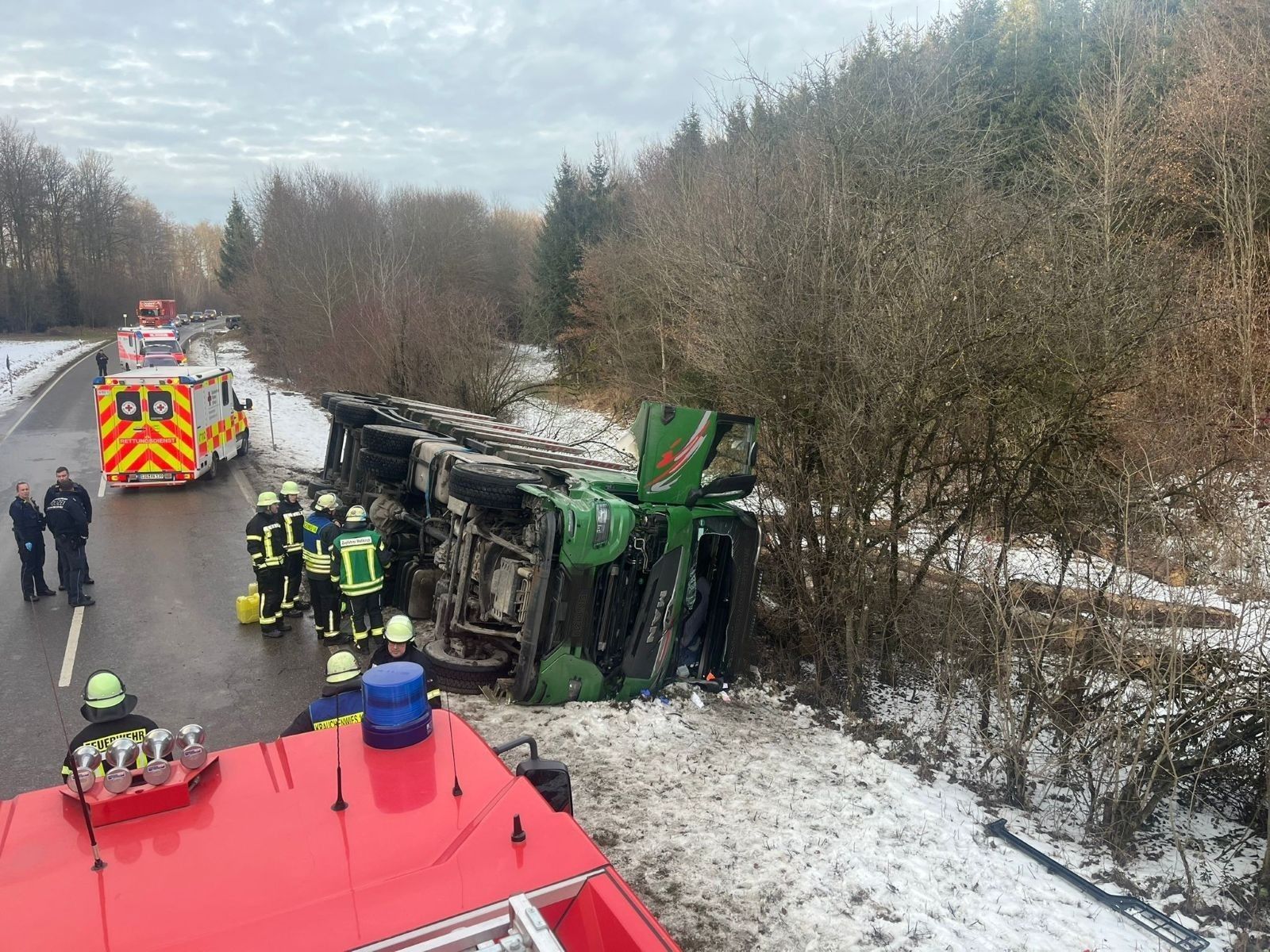 Wegen eines LKW-Unfalls war am Mittwochnachmittag die K 8267 Inzigkofen – Göggingen mehrere Stunden gesperrt. Ein mit Holz beladener Sattelzug wollte aus einem Waldweg Richtung Göggingen fahren. Der Waldweg war vereist und abschüssig, dadurch verlor der Fahrer die Kontrolle und der Lkw kippte auf die Seite und blieb neben der Straße liegen. Die Baumstämme rollten von der Ladefläche. Die Alarmierung lautete zwei eingeklemmte Personen in einem umgestürzten Lkw. Deshalb wurde die zweithöchste Alarmierungsstufe ausgerufen. Das bedeutete Alarm für alle Löschbezirke von Krauchenwies. Zusätzlich kam Unterstützung aus Meßkirch. HvO, Rettungsdienst, Polizei, Umweltamt und Notfallseelsorge waren ebenfalls vor Ort. Gottseidank waren Fahrer und Beifahrer nicht eingeklemmt, sondern nur eingeschlossen. Leicht verletzt wurden sie von der Feuerwehr befreit und dem Rettungsdienst übergeben. Sie kamen beide ins Krankenhaus. Weitere Tätigkeiten der Feuerwehr: Ausgelaufene Betriebsstoffe auffangen und den Brandschutz sicherstellen. Im Rahmen der Unfallaufnahme und den aufwendigen Bergungsmaßnahmen, war die Straße bis kurz vor 19 Uhr vollständig gesperrt.