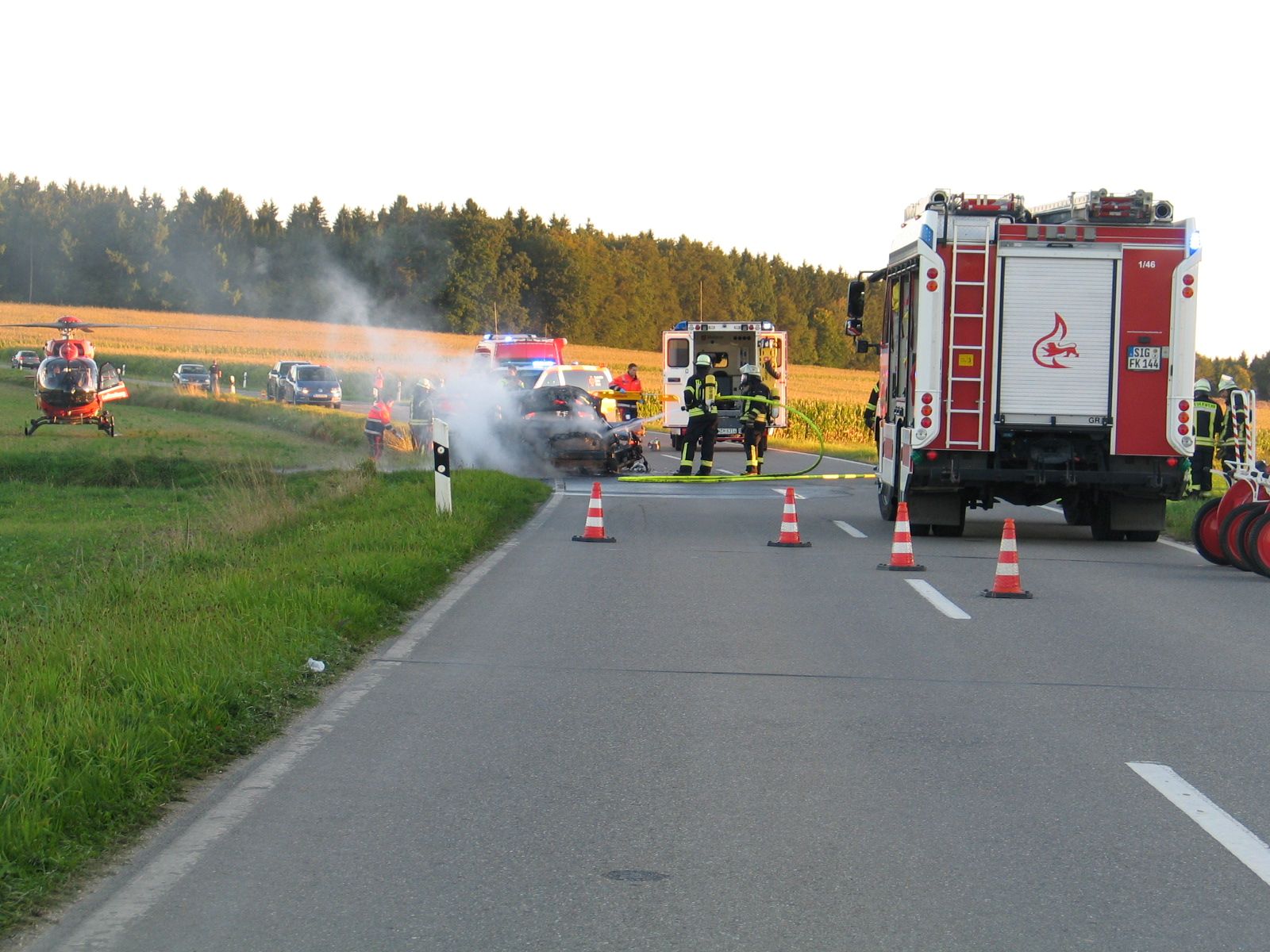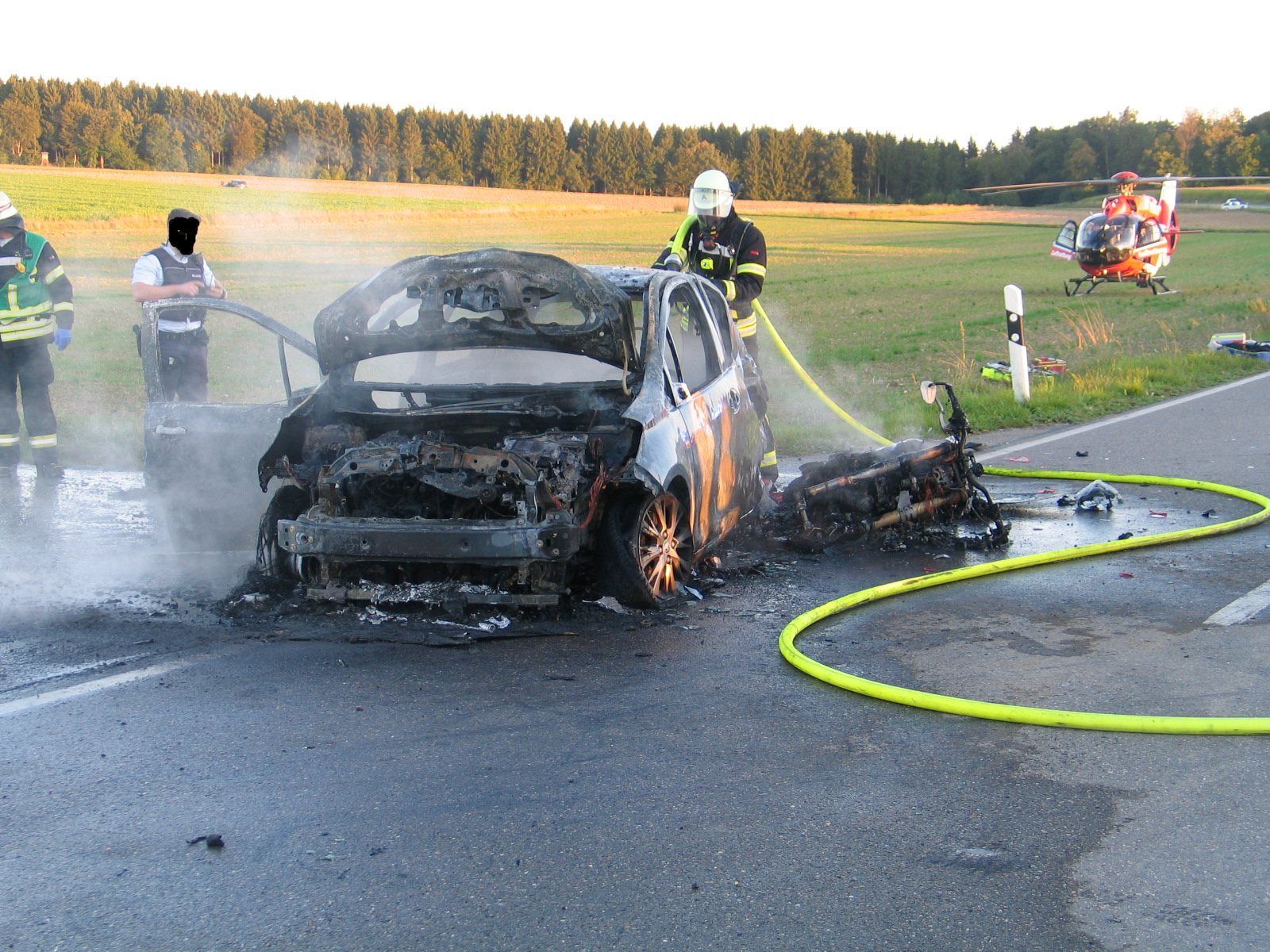 Auf der Kreisstraße 8241 zwischen Krauchenwies und Hausen a. A. kam es am Mittwochabend zu einer heftigen Kollision zwischen einem Pkw und einem Motorrad. Dabei gerieten beide Fahrzeuge in Brand und brannten vollständig aus. Der Motorradfahrer wurde schwer verletzt und kam mit dem Rettungshubschrauber ins Krankenhaus. Auch der Pkw Fahrer kam mit Verletzungen ins Krankenhaus. Der genaue Unfallhergang wird noch ermittelt. Die Feuerwehr Krauchenwies löschte die Fahrzeuge und fing die Betriebsstoffe auf. Außerdem waren der Rettungsdienst, die Polizei und die Helfer vor Ort Gruppe Krauchenwies im Einsatz. Der Sachschaden stand noch nicht fest. Die Straße war mehrere Stunden gesperrt.